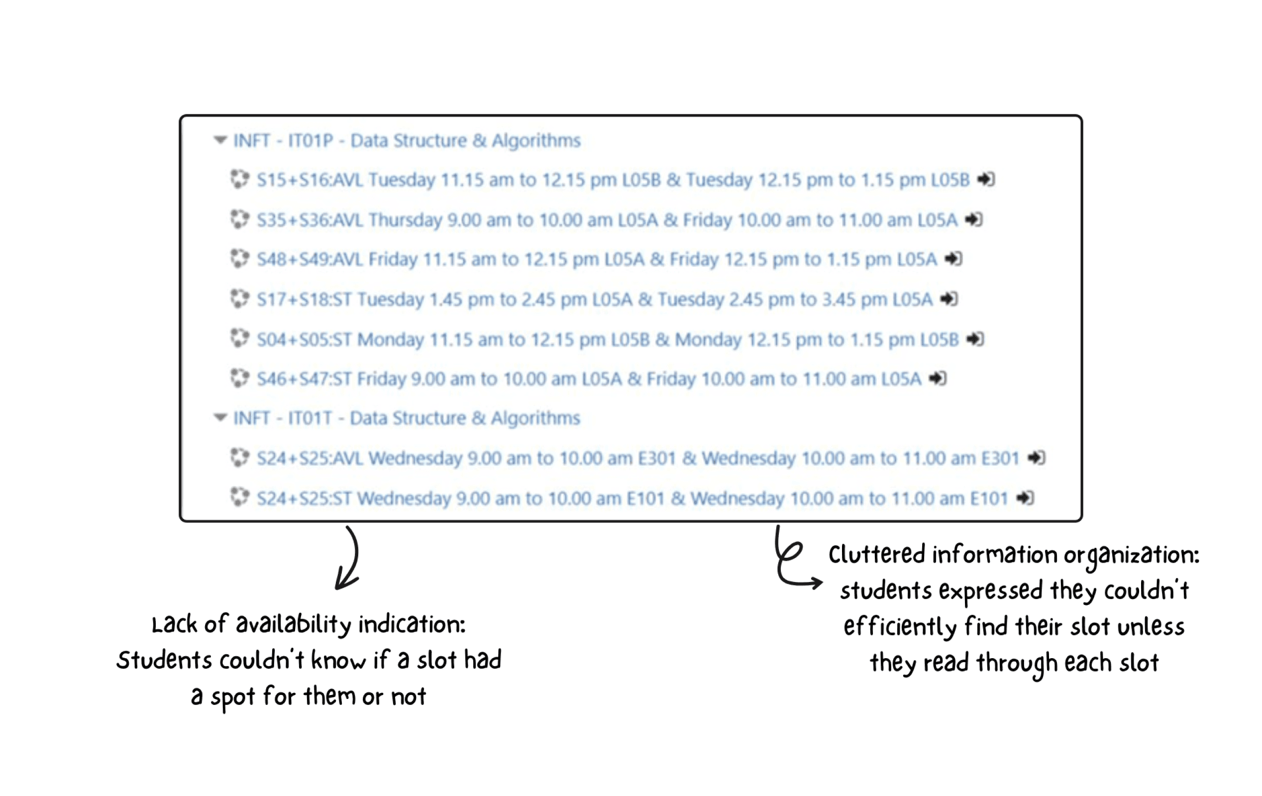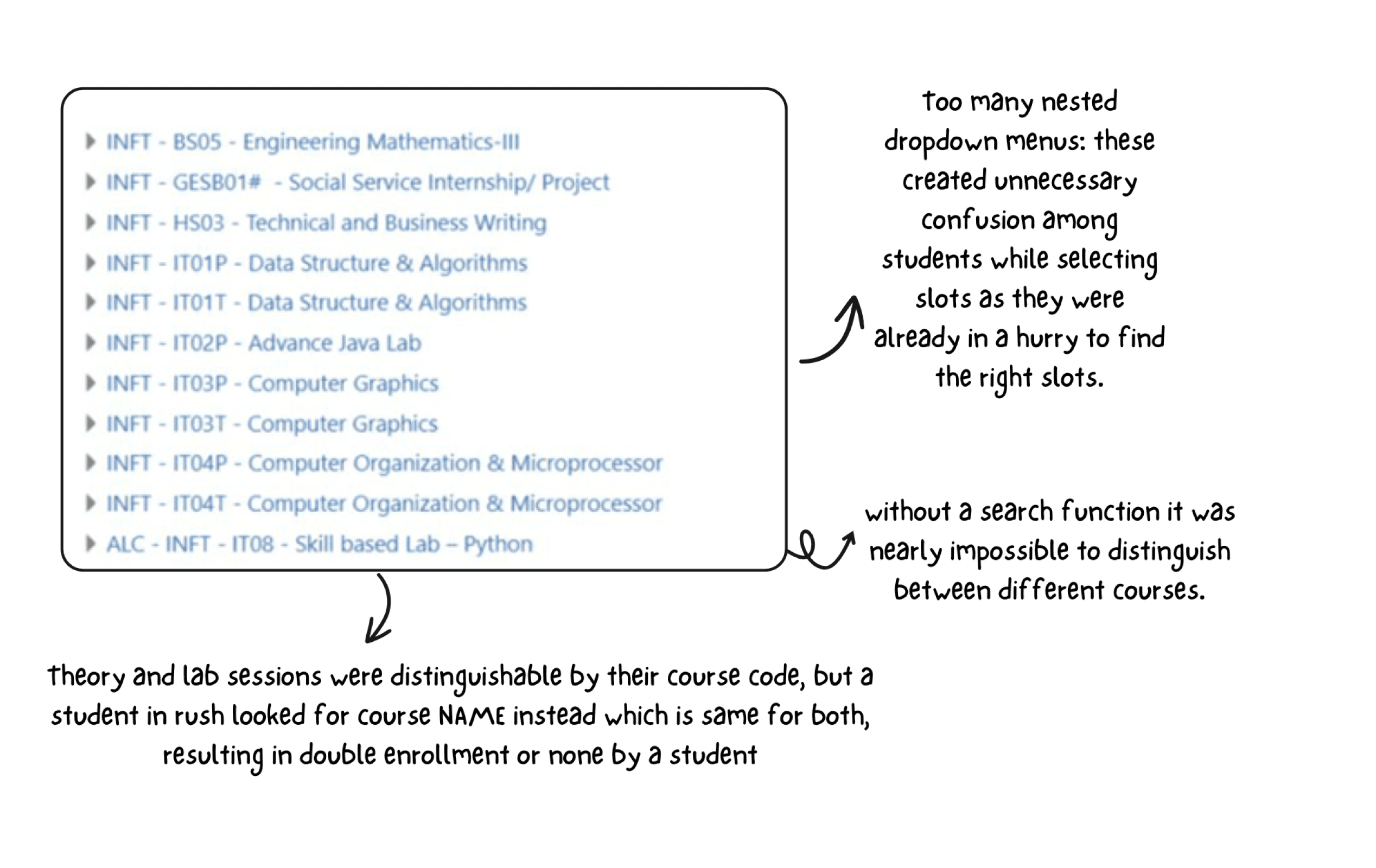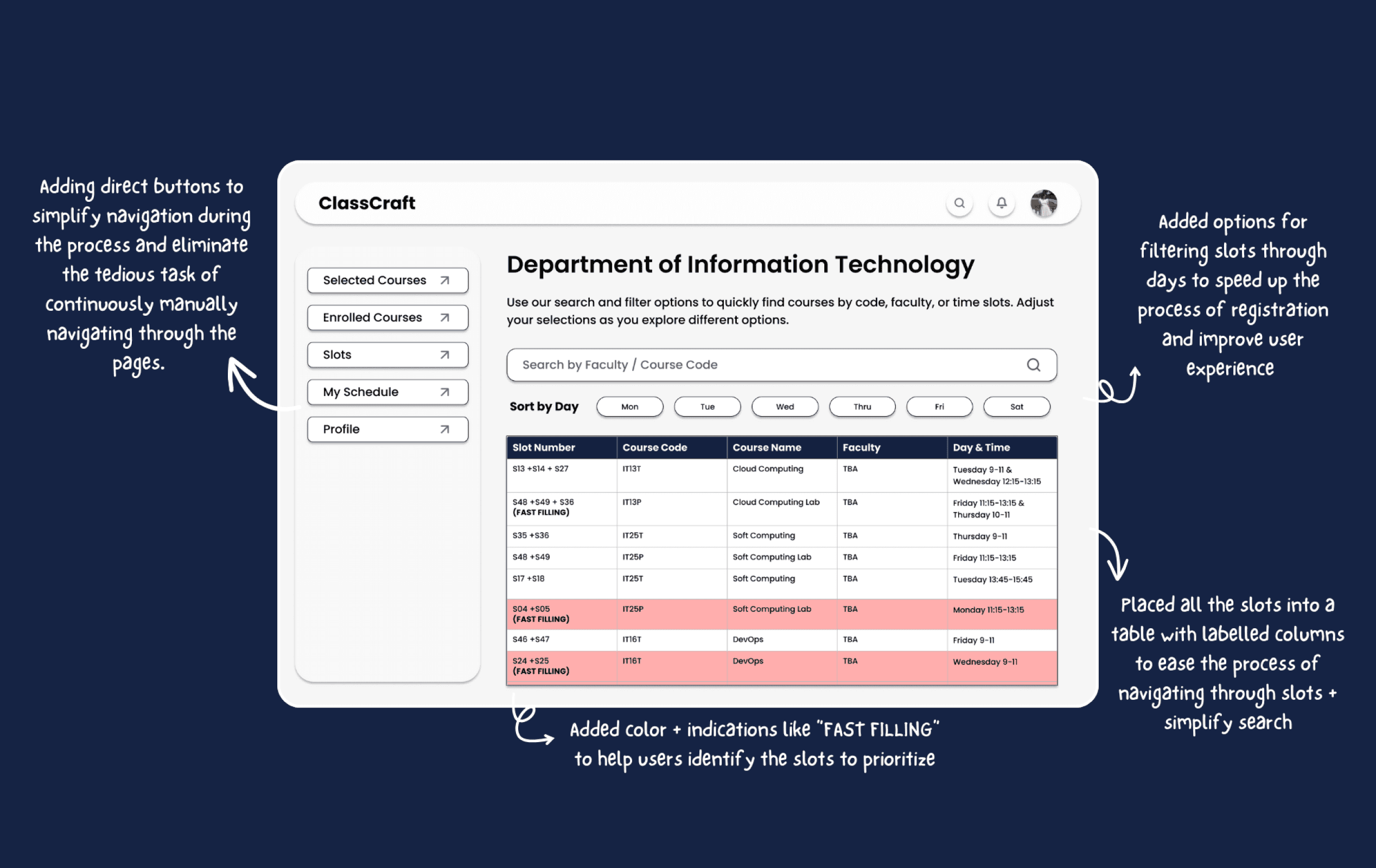 "It was difficult to effectively find the slot you were interested in, it was time consuming to map course code with course and while we do this the slot was full."