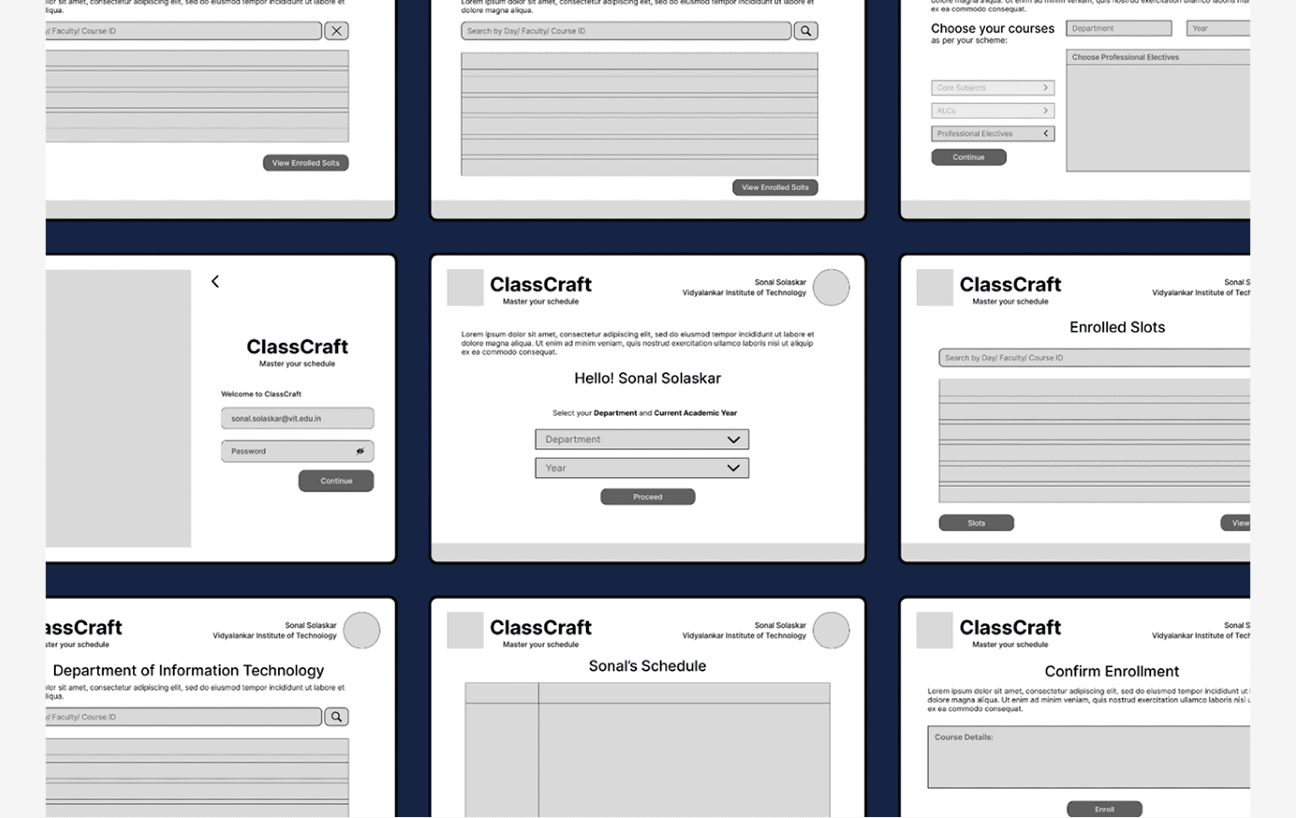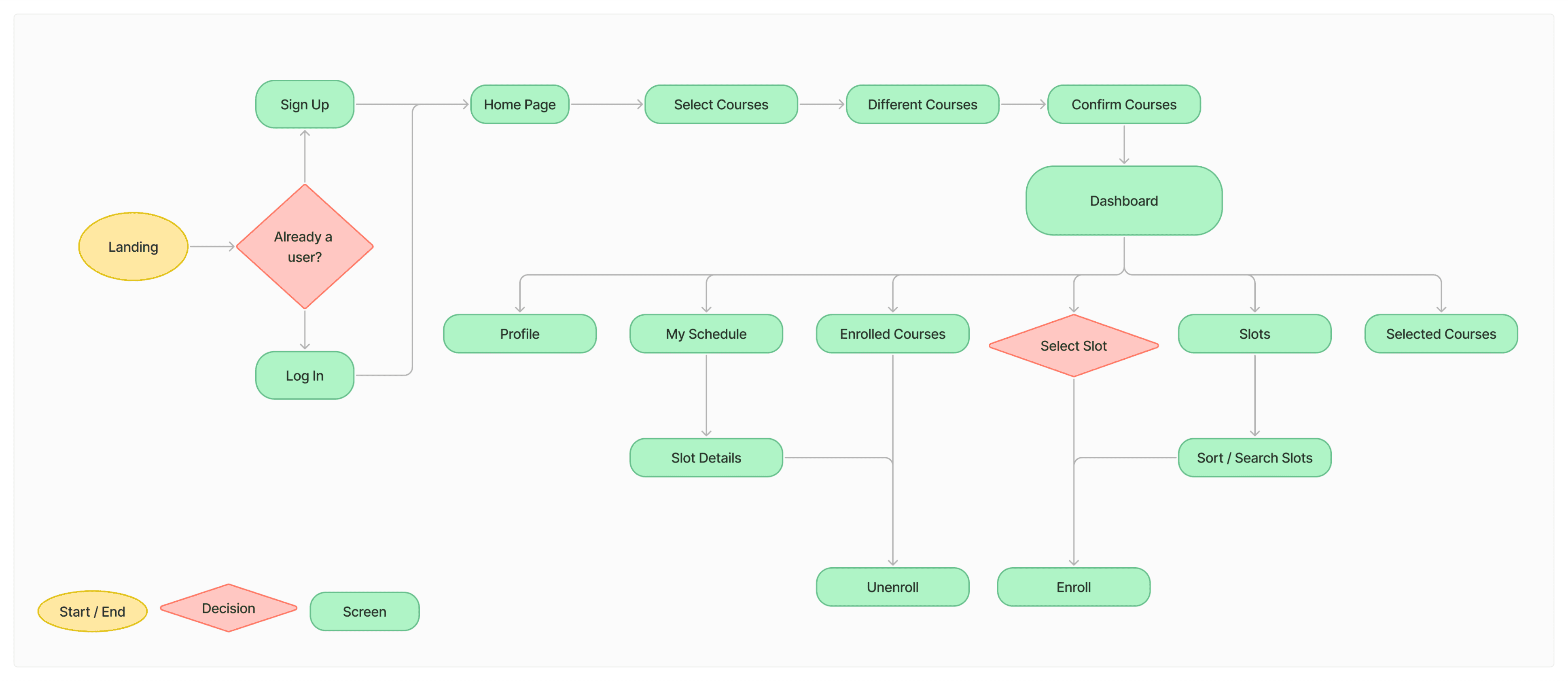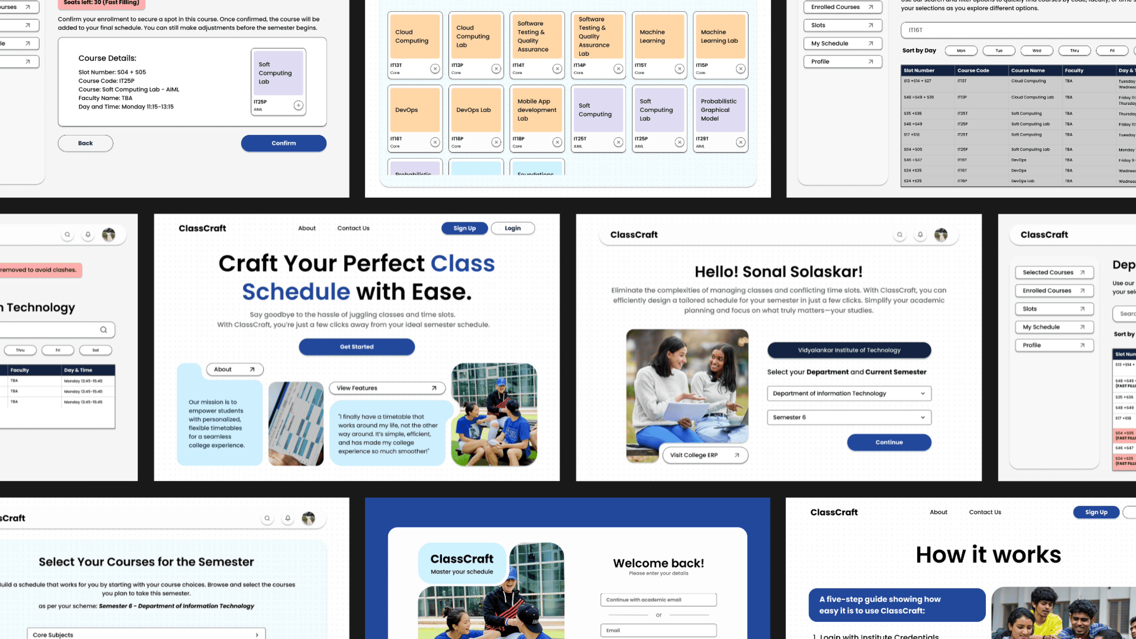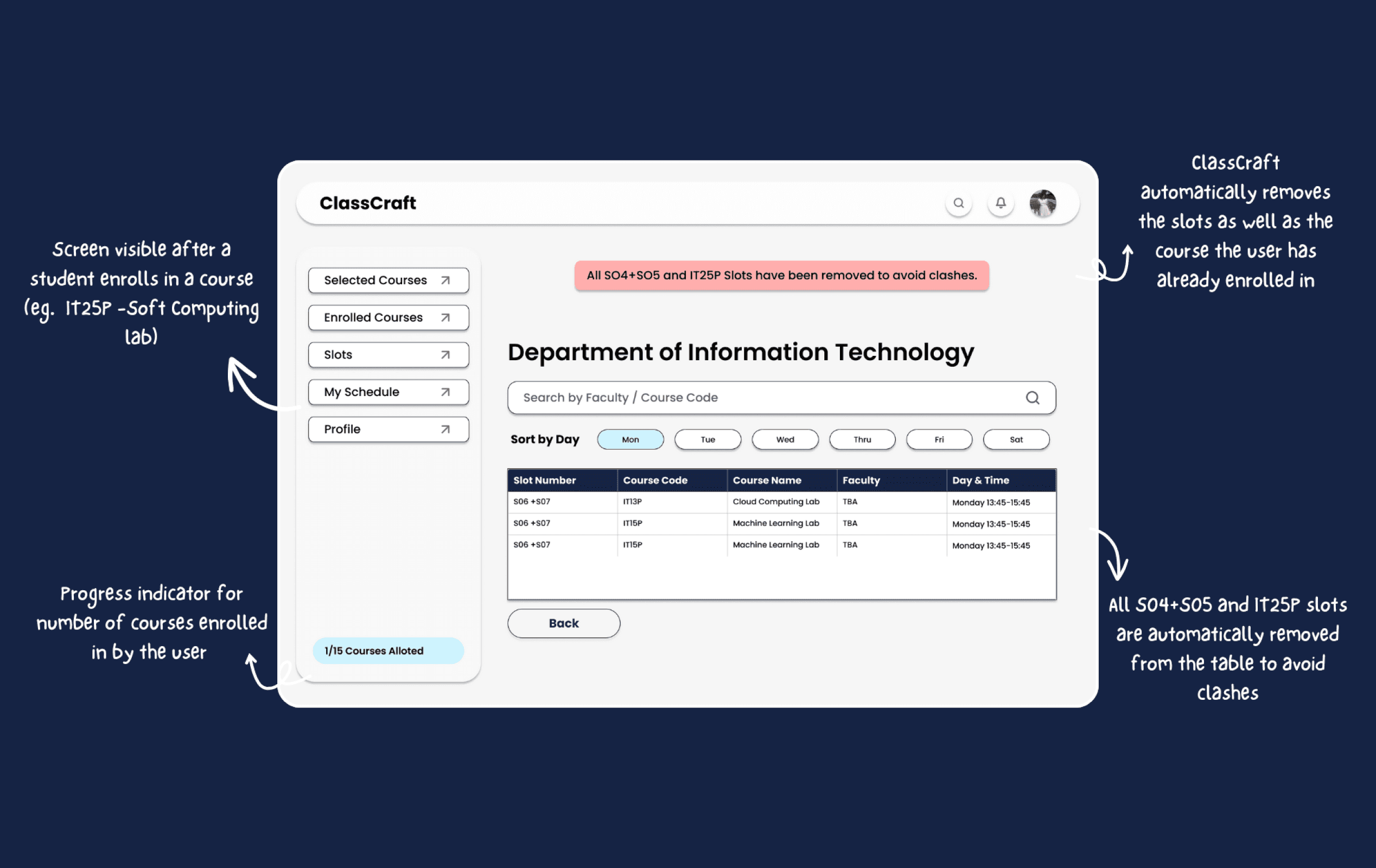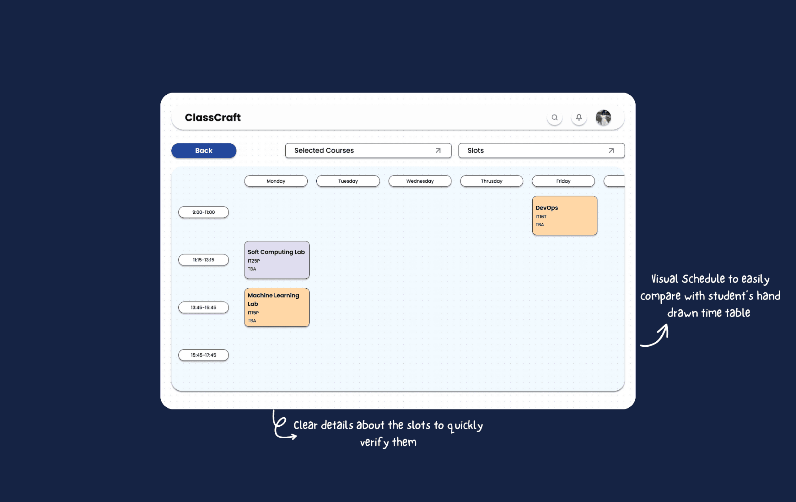 Slot selection integrates usability heuristics like visibility of system status and user control. With sortable columns and filters, users can compare, select, and adjust class timings without guesswork. The experience minimizes frustration by preventing dead ends, users can always backtrack or re-filter, preserving a sense of control.